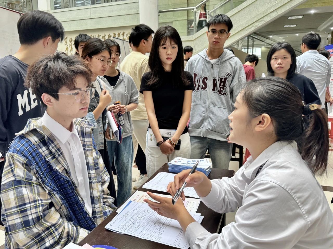 “未来职场的发展晋升空间是怎么样的?”“工作内容是否以实践操作为主?”……招聘会现场气氛热烈,参会企业展位前人头攒动。毕业生踊跃投递简历并就自己关心的招聘岗位、薪酬期望、职业发展前景等与用人单位进行充分洽谈;用人单位通过展板、海报及现场讲解等形式,详细介绍企业文化、招聘岗位、晋升渠道等,吸引了大量毕业生驻足交流。