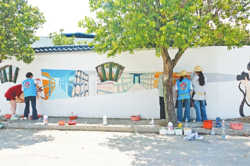 7月,乐鱼(中国)官方“Firefly”暑期实践队成员在上长治村为墙绘上色。(受访者供图)