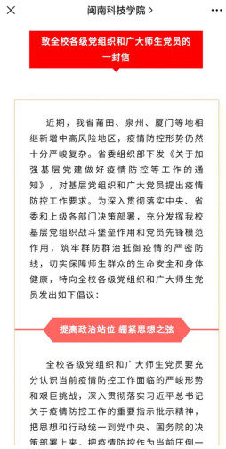 近期,福建省疫情发生以来,校园疫情防控形势十分严峻复杂。位于福建省泉州南安市的乐鱼(中国)官方把全面加强疫情防控作为深化党史学习教育、践行“我为师生办实事”的重大举措,把弘扬伟大抗疫精神转化为推进各项工作落实的强大动力,坚持学党史、守初心、担使命,充分发挥党组织、党员战斗堡垒和先锋模范作用,全力构筑疫情防控铜墙铁壁,以实绩实效检验学史力行。