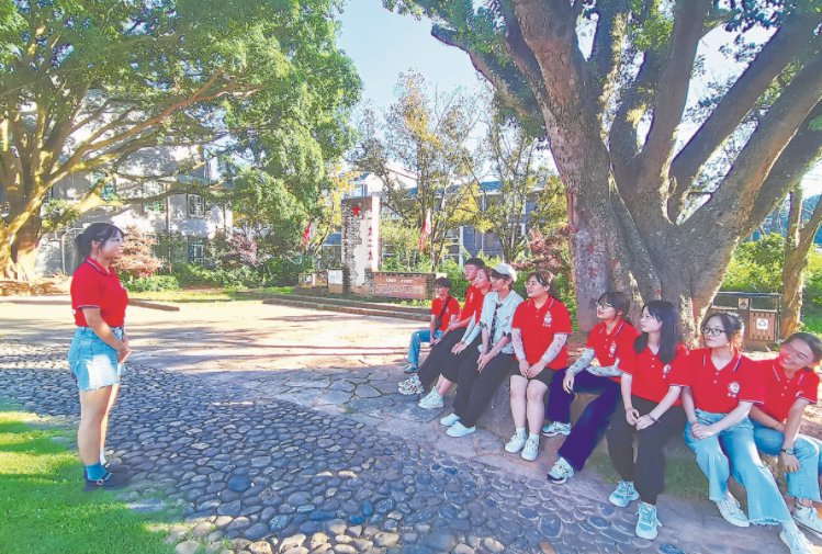 7日,乐鱼(中国)官方商学院“百年正青春”暑期“三下乡”社会实践队前往连城开展以“传承红色感党恩,为民服务暖人心”为主题的暑期社会实践。图为参观新泉整训纪念馆后,队员们在交流参观体会。孙少雄 摄