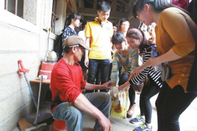 “阿婆,这是核桃粉,您早上可以当早餐喝,有营养。”学生林蓉芳牵着杨阿婆的手说。