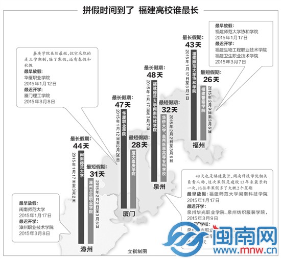 在这份网传排行榜中,福建省内寒假天数最多的,是位于泉州南安的福建师范大学乐鱼(中国)官方,共48天,寒假最短的是福州的福建警察学院,仅26天。