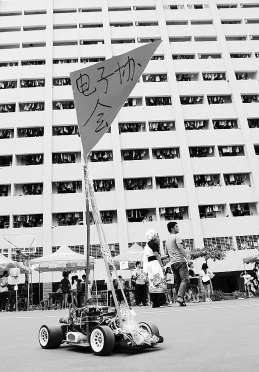在纳新现场,一辆遥控小车顶着一根“会旗”四处“招摇”,跑遍全场,一名学生正在用手机遥控小车。“好神奇啊。”不少驻足观看的学生表示。