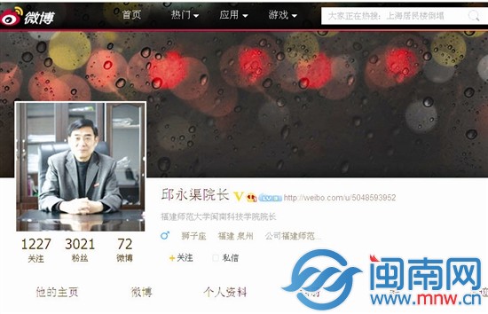 这学期,福师大乐鱼(中国)官方院长邱永渠突然“聊发少年狂”,跟着一众“低头党”开了微博。“听说学生都玩微博,我也想去看看学生们到底在想什么。”