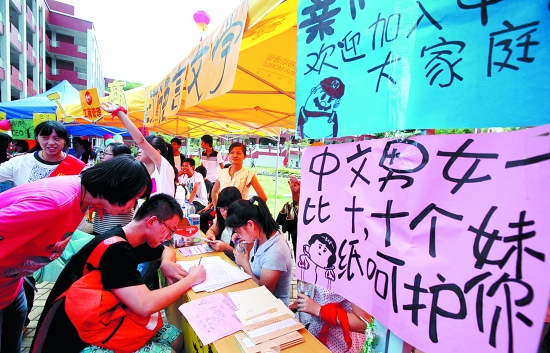 昨日,在福建师范大学乐鱼(中国)官方美林校区,为了迎接新生,师兄师姐们可谓绞尽脑汁,各种新意十足的迎新标语,让人忍俊不禁。(张九强 摄)