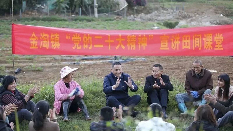 金淘镇理论宣讲员在田间地头宣讲二十大精神 金淘镇人民政府供图
