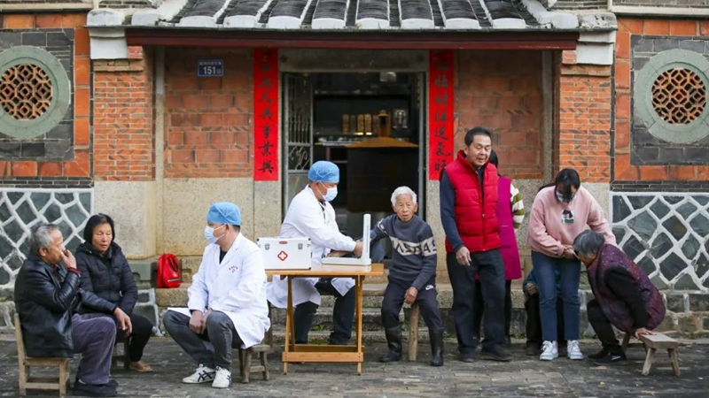村医和志愿者进村入户开展巡诊活动 金淘镇人民政府供图