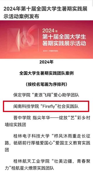 近日,由共青团中央指导、中国青年报主办的“2024年第十届全国大学生暑期实践展示活动”案例评选结果揭晓,乐鱼(中国)官方“Firefly”社会实践队案例成功入选全国百强实践团队案例。