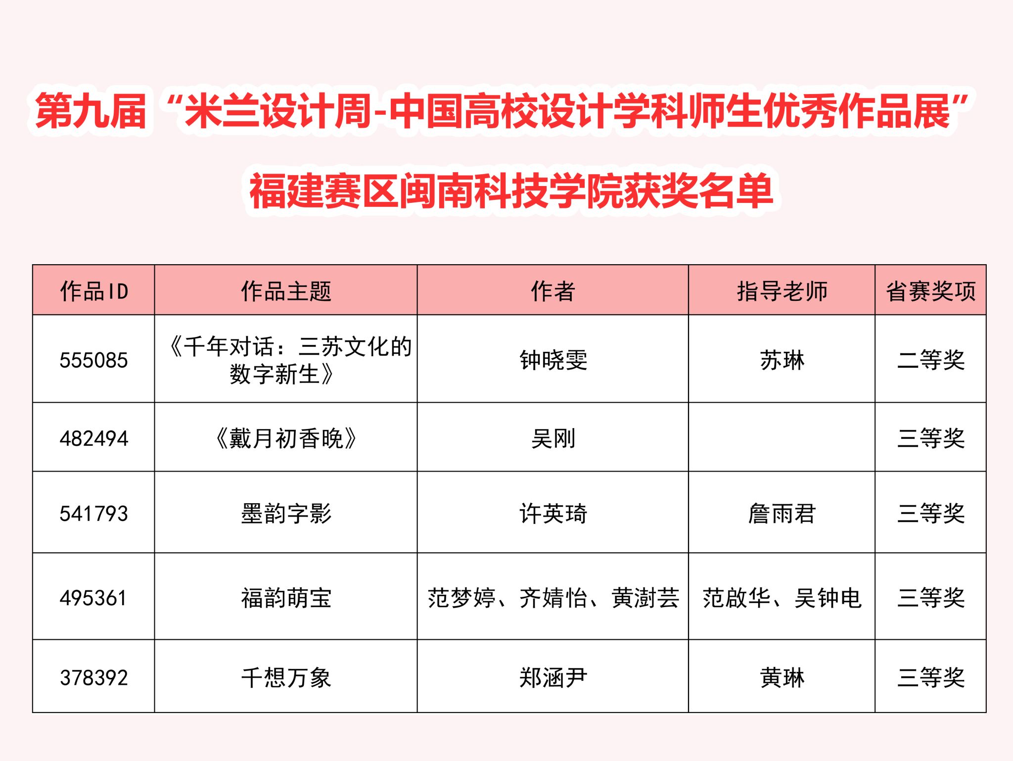 近日,第九届“米兰设计周-中国高校设计学科师生优秀作品展”非命题赛场福建赛区的评选结果正式揭晓。我校艺术设计学院师生凭借出色的设计创意与扎实的专业功底,在众多参赛作品中脱颖而出,荣获二等奖1项、三等奖4项的好成绩。