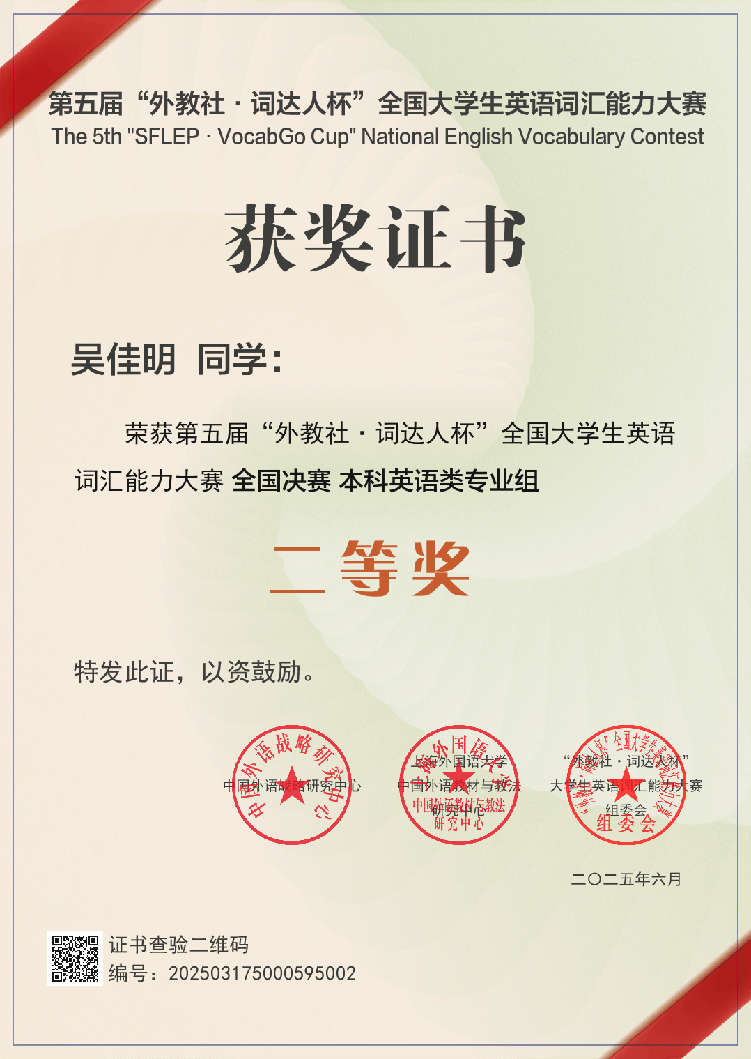 近日,由中国外语研究中心、中国外语教材与教法研究中心和上海外语教育出版社联合主办的第五届 “外教社・词达人杯” 全国大学生英语词汇能力大赛全国总决赛圆满落幕。我校人文学院2022级商务英语吴佳明同学(指导老师:黄艺俊)获得本科英语类专业组二等奖的好成绩,实现该赛事全国总决赛奖项零的突破。