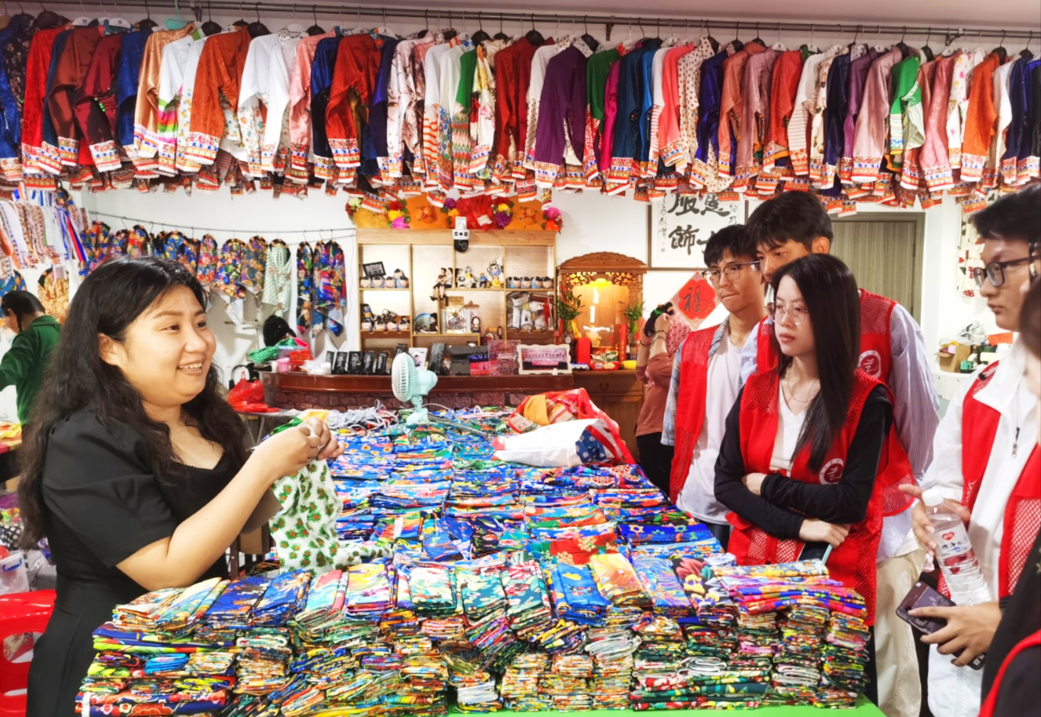 沉浸式体验国家级非物质文化遗产——惠安女服饰及其独特的“拉布布头巾”文化,是此次实践的重头戏之一,实践队员们在泉州市传统工艺青年传承人、惠安女服饰非遗传承人曾茹婷老师的悉心指导下,亲身穿戴体验惠女服饰,尤其是“拉布布头巾”的创新发展,大家深刻感悟劳动人民的智慧和惠女服饰的文化魅力。