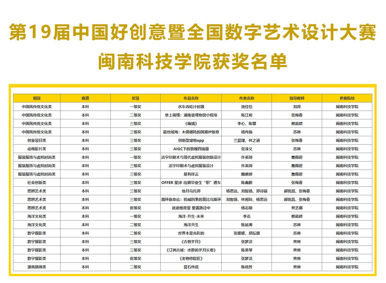 近日,第19届中国好创意暨全国数字艺术设计大赛圆满落下帷幕,我校艺术设计学院学子获一等奖3项、二等奖3项、三等奖11项、优等奖2项的好成绩,充分展现了闽科学子扎实的专业素养和卓越的创新能力。