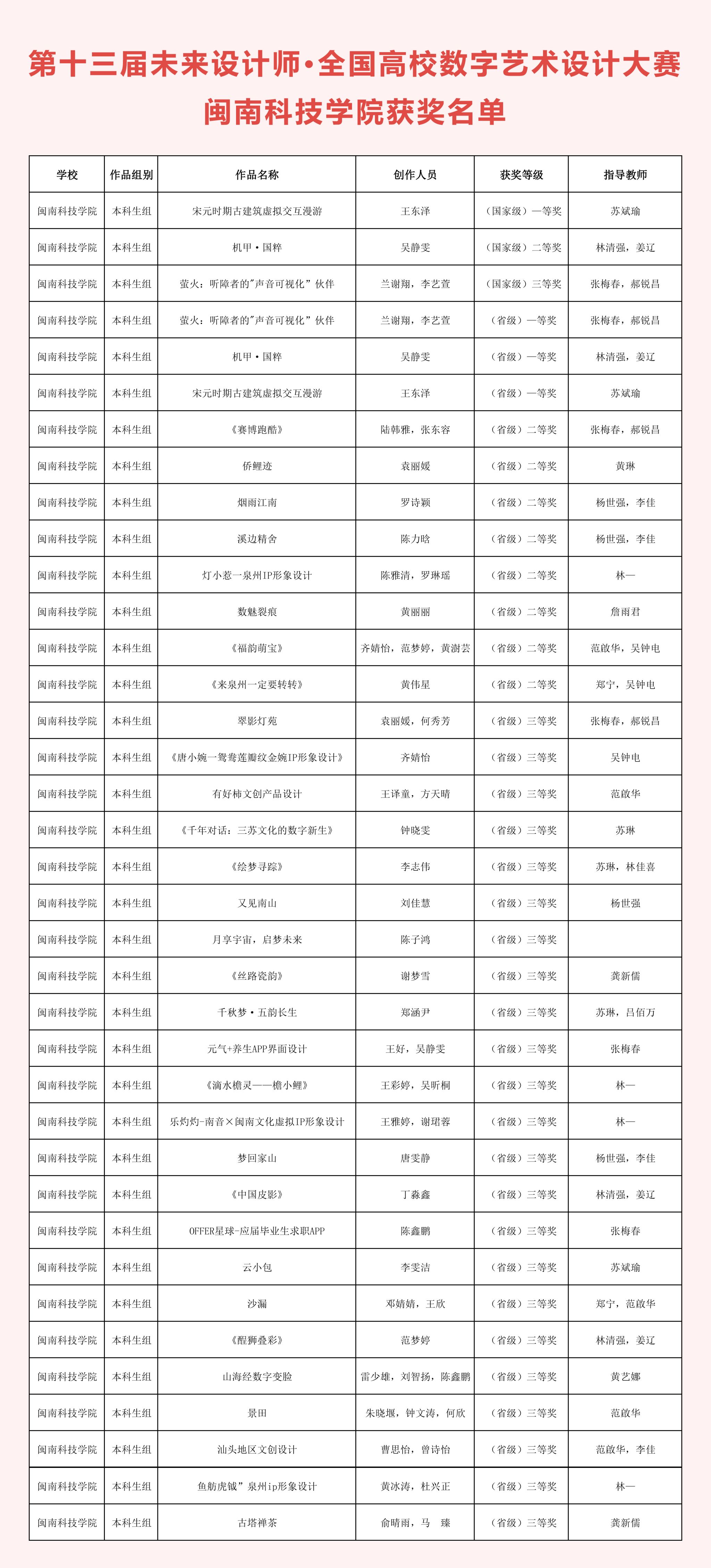近日,第十三届未来设计师·全国高校数字艺术设计大赛(NCDA)公布获奖名单。我校艺术设计学院学子在激烈角逐中脱颖而出,取得全国总决赛一等奖1项、二等奖1项、三等奖1项,福建省赛区一等奖3项、二等奖8项、三等奖23项的好成绩。