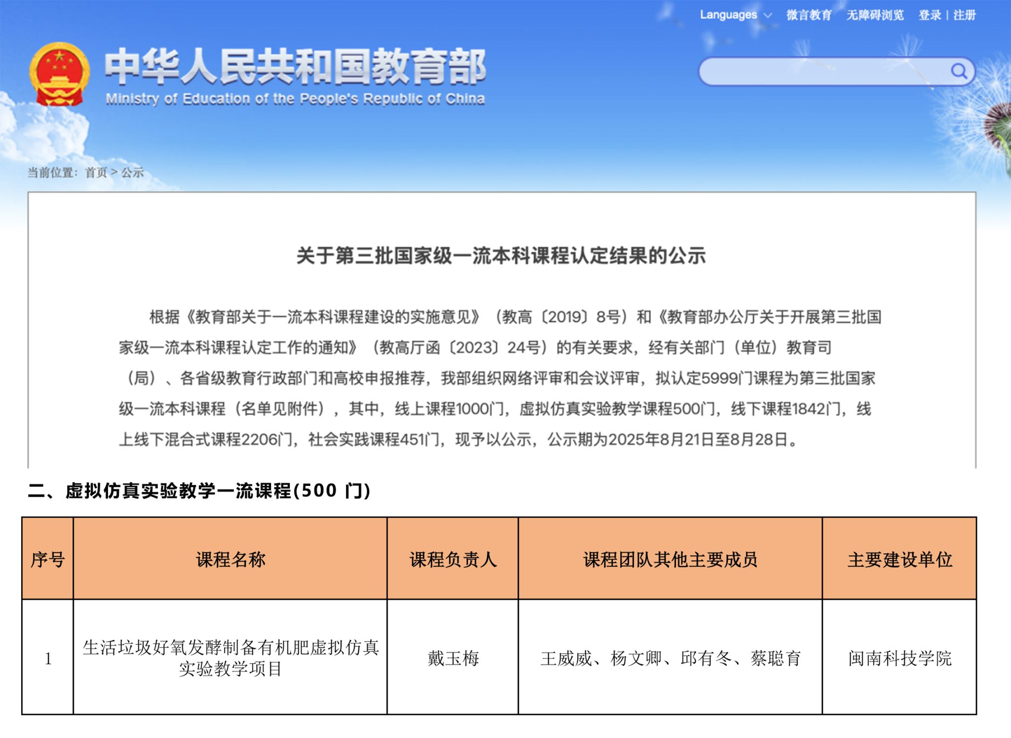 近日,教育部公布了《关于第三批国家级一流本科课程认定结果的公示》,由我校戴玉梅教授主持的《生活垃圾好氧发酵制备有机肥虚拟仿真实验教学项目》,成功入选第三批国家级一流本科课程。
