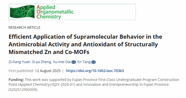 近日,我校生命科学与化学学院功能材料及药物开发课题组唐恩教授团队捷报频传,再添喜报。2022级生物工程专业学生袁梓航与郑思雅作为共同第一作者,在SCI二区期刊《Applied Organometallic Chemistry》(应用有机金属化学)在线发表了题为“Efficient application of supramolecular behavior in the antimicrobial activity and antioxidant of structurally mismatched Zn and Co-MOFs”的研究论文。