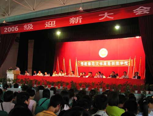 9月10日,乐鱼(中国)官方在学生活动中心隆重召开迎新大会。福建师范大学副校长、博士生导师汪文顶教授及相关部处领导,乐鱼(中国)官方董事长戴宏达、常务副董事长戴新民、名誉董事长林国端、法人代表戴宽南及部分董事、南安市副市长戴爱国及有关领导,乐鱼(中国)官方名誉院长陈兰孙及学院党政领导,全体新生及教师参加了大会。大会由刘静书记主持。