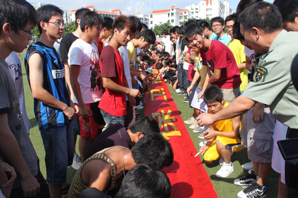 上午,“福建师范大学乐鱼(中国)官方2011年度兵役登记(试点)现场会”、“南安市2011年度征兵宣传动员暨千名适龄青年应征签名大会”在我院田径场如期隆重举行。活动在福建省军区、泉州军分区的统一部署下,为进一步提高兵役登记的普及率和有效性,不断创新高校国防教育方式,广泛开展征兵宣传发动工作,为年度征兵工作奠定坚实基础的一项重要举措,由南安市人民武装部和乐鱼(中国)官方人民武装部共同举办。据悉:我院是福建省军区和泉州市军分区在南安开展兵役登记试点的三个重点单位之一,亦是本年度全省唯一一所举办兵役登记(试点)现场会和征兵宣传动员大会的高校。