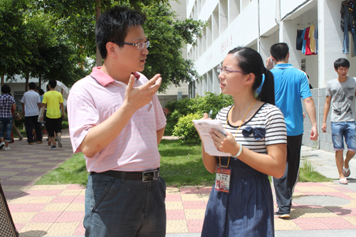 在学生社区门口,郭院长和林书记向学生干部细心询问各专业的迎新进展情况。郭院长告诉记者,与往年相比,今年学院各专业的迎新工作部署得更周到、更规范,志愿者队伍也相对壮大了。在新生咨询点处,郭院长为贫困生送上慰问金,与新生、家长亲切交谈,询问他们的基本情况。随后,郭院长一行来到新生宿舍,看望并慰问了新生,视察了学生服务部和食堂。