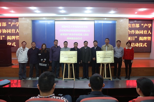4月12日,福建师范大学乐鱼(中国)官方▪高博应诺“教育部产学研合作协同育人项目”揭牌暨启动仪式在我院学术报告厅举行。苏州高博应诺信息科技有限公司总经理周世锋、副总经理兼教学总监张益桃,院领导邱永渠、李彬源、吴勇,相关系部负责人、教师代表及2014级计算机科学系部分学生共同参加了启动仪式。启动仪式由副院长吴勇主持。