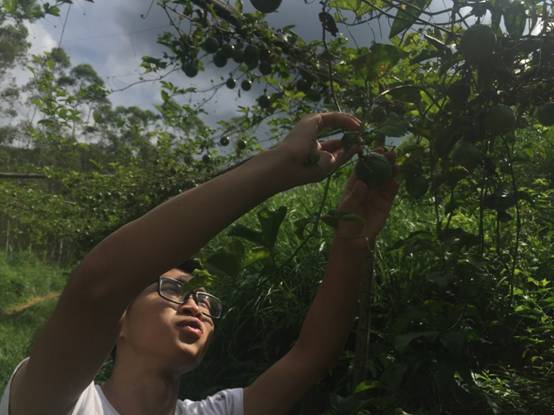 实践队队员们在农场中认识植黄金百香果、台湾无籽青柠檬、马铺橙等多种种植水果,并体验了果树施肥、除草等农场日常工作。