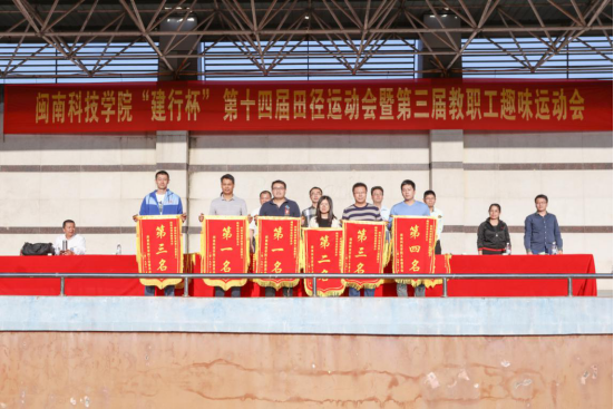 本届运动会总裁判长周书磊老师宣读本届运动会获奖团队名单。计算机信息学院、生命科学与化学学院获教工趣味运动会团体总分第一名,商学院获第二名,通识教育学院、马克思主义学院、人文学院获第三名,光电信息学院获第四名;计算机信息学院、人文学院、艺术设计学院、商学院、土木工程学院获开幕式入场表演前五名;商学院、光电信息学院、计算机信息学院、生命科学与化学学院、艺术设计学院获田径运动会团体总分前五名;艺术设计学院、计算机信息学院、生命科学与化学学院、商学院、人文学院获“精神文明奖”。