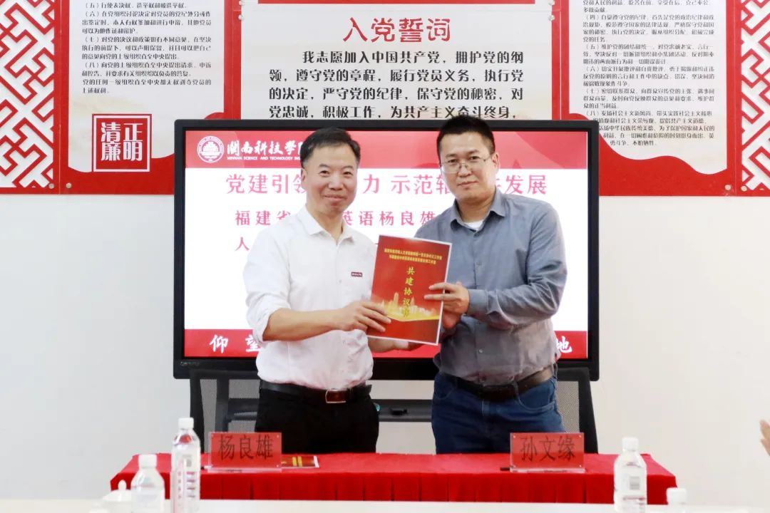 在工作室共建签约仪式上,人文学院教师第一党支部书记工作室与福建省中学英语杨良雄劳模名师工作室开展共建活动,双方进行了现场签约,两个工作室的共建将助力人文学院学科发展、专业建设、人才培养、师资培训等方面的共同发展。