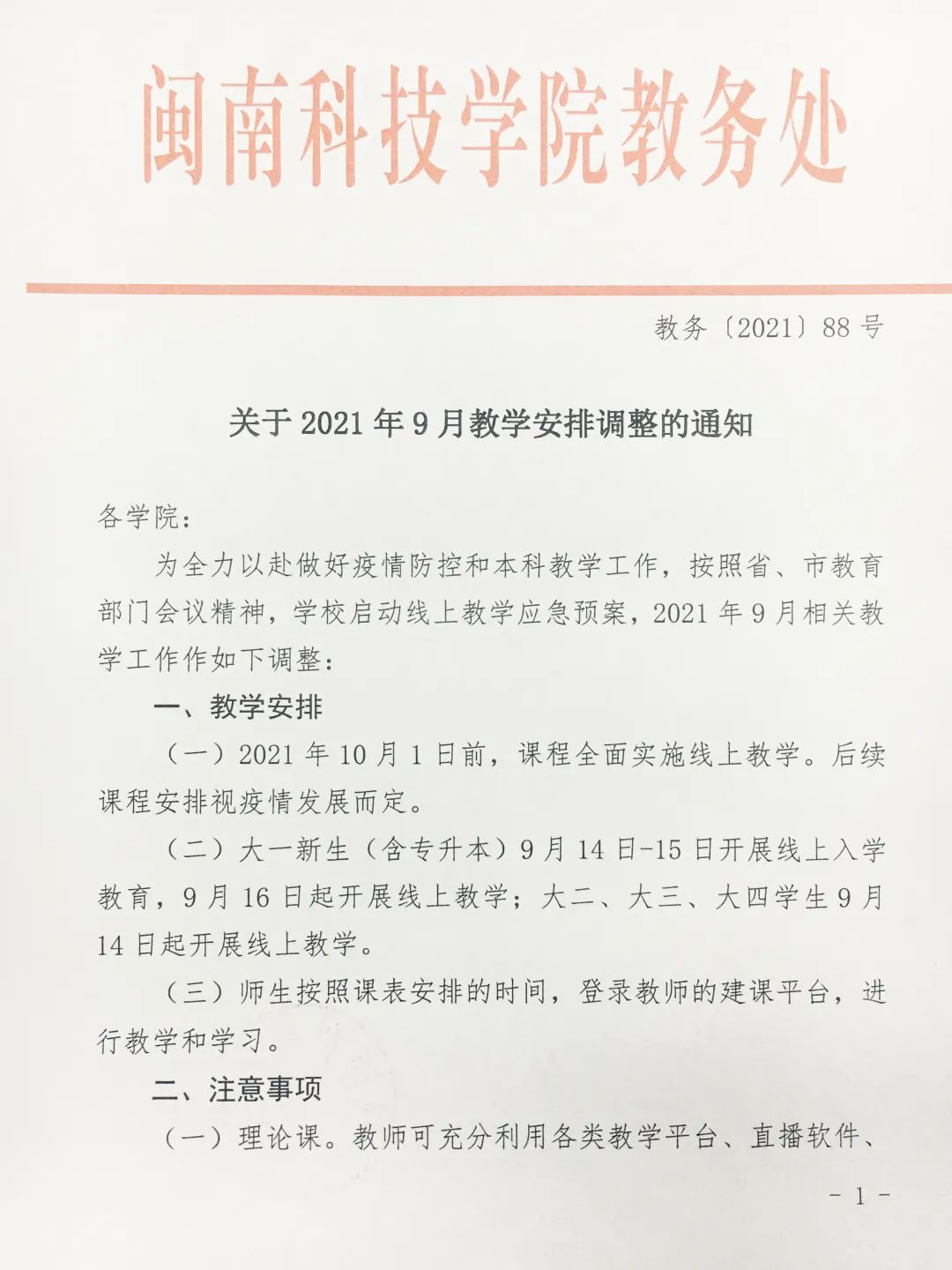 我校严格贯彻落实教育部、省教育厅等部门关于加强校园疫情防控工作的通知精神,对秋季新学期教学工作进行了详细谋划。各学院在暑期根据《关于落实2021-2022学年第一学期教学任务的通知》,制定了开学第1、2周进行线上教学的预案。针对9月的突发疫情,教务处及时制定《关于2021年9月教学安排调整的通知》,明确10月1日前全面开展线上教学,大一新生(含专升本)9月14日-15日开展线上入学教育,9月16日起开展线上教学;大二、大三、大四学生9月14日起开展线上教学。全校师生迅速行动,在短短1天内完成线下线上的教学模式切换,实现了线上教学课程全覆盖、任课教师全覆盖、学生全覆盖。