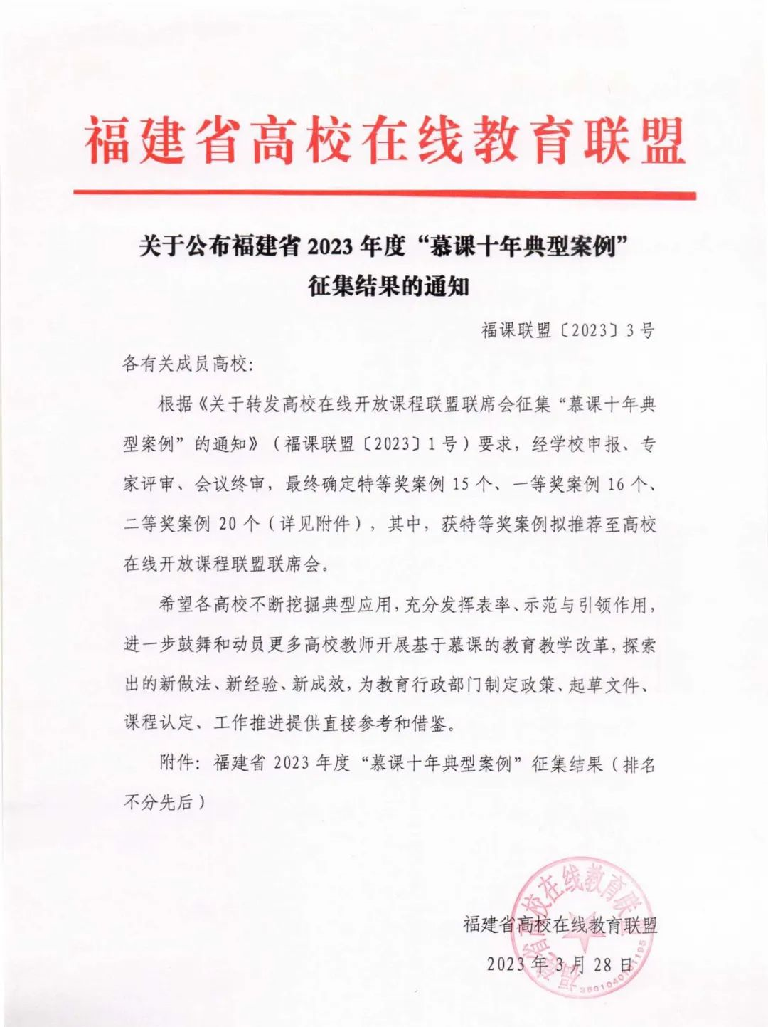 2023年度“慕课十年典型案例”由福建省高校在线教育联盟发起,围绕教育数字化战略行动、聚焦慕课领域征集典型案例。下一阶段,学校将以此为契机不断挖掘典型应用,充分发挥表率、示范与引领作用,进一步鼓舞和动员乐鱼网页版教师开展基于慕课的教育教学改革,探索出的新做法、新经验、新成效,不断提升课程建设质量。