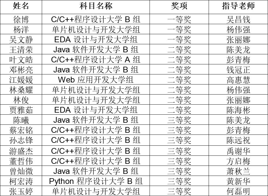 近日,第十四届蓝桥杯全国软件和信息技术专业人才大赛个人赛竞赛结果公布。我校参赛学子获得软件类和硬件类一等奖3项、二等奖7项、三等奖8项的好成绩。其中,计算机信息学院2021级计算机科学与技术专业徐博、2020级智能科学与技术专业杨洋、吴文静入围全国总决赛。