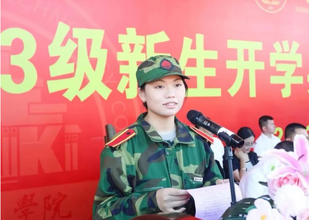 军训承训部队副政治教导员张彬松做军训动员讲话。生命科学与化学学院周强教授作为教师代表、商学院2021级投资学专业姚冬梅同学作为老生代表、土木工程学院2023级工程造价专业黄秋昕同学作为新生代表分别发言。