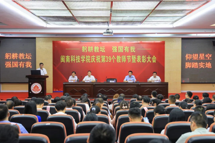 9月13日下午,我校隆重召开庆祝第39个教师节暨表彰大会。校领导游小波、李旭、周勇军、林树生、邱永渠出席表彰大会。校长游小波代表学校党政致辞。常务副校长周勇军、副校长邱永渠宣读表彰名单。表彰大会由校党委书记李旭主持。