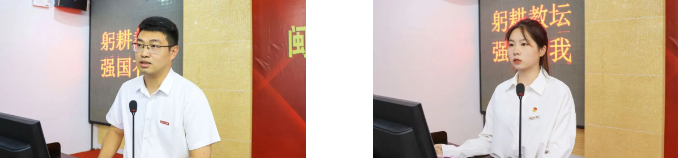 与会校领导为受表彰先进个人颁奖,光电信息学院张荣辉老师作为教师代表、艺术设计学院2021级产品设计专业陈瑾同学作为学生代表先后发言。